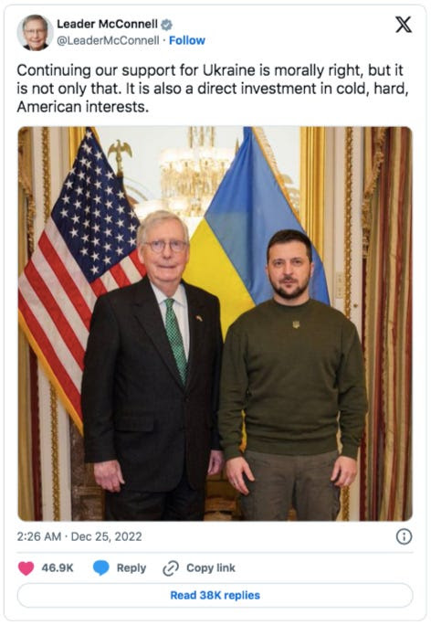 « Il est dans l’intérêt de la sécurité nationale de l’Amérique que la Russie de Poutine soit vaincue en Ukraine », a tweeté l(a) sénat(rice) Lindsey Graham, toujours passionné(e) de guerre.