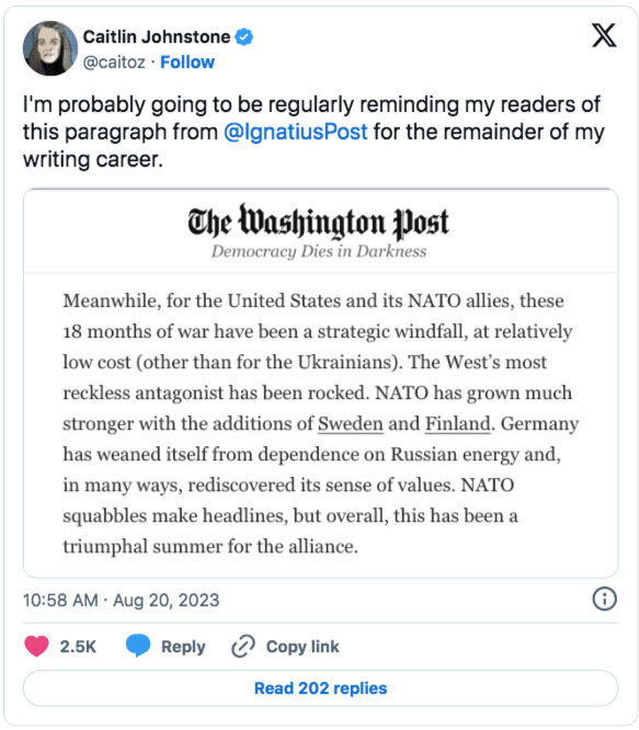« Pendant ce temps, pour les États-Unis et leurs alliés de l’OTAN, ces 18 mois de guerre ont été une aubaine stratégique, à un coût relativement faible (sauf pour les Ukrainiens). L’antagoniste le plus imprudent de l’Occident a été ébranlé. L’OTAN est devenue beaucoup plus forte avec l’arrivée de la Suède et de la Finlande. L’Allemagne s’est affranchie de sa dépendance à l’égard de l’énergie russe et a retrouvé, à bien des égards, son sens des valeurs. Les querelles au sein de l’OTAN font la une des journaux, mais dans l’ensemble, cet été a été triomphal pour l’alliance.»