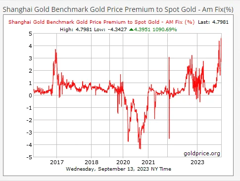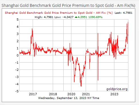 Les prix de l’or physique ont clôturé 6 % au-dessus de NY/Londres hier soir en Chine ; La Chine est le plus grand producteur et consommateur d’or au monde. Cette prime importante signifie que l’or affluera vers les BRICS et l’OPEP. La prime la plus élevée jamais vue est payée 3 semaines après que l’OPEP a rejoint les Brics ; les chances que la Chine joue sa « carte d’or » ont considérablement augmenté.