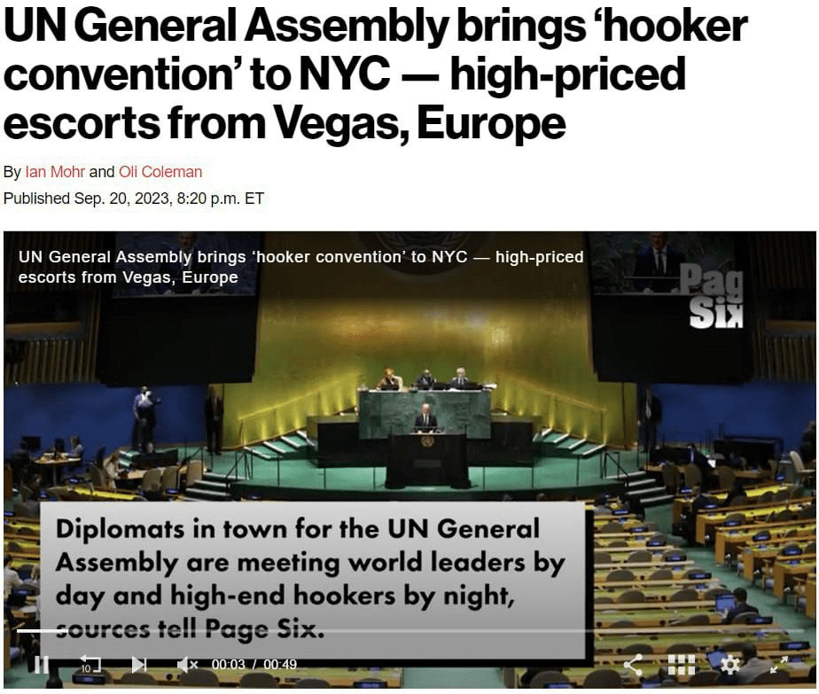Les diplomates à New York pour l’Assemblée générale des Nations Unies rencontrent les dirigeants du monde le jour et les prostituées haut de gamme la nuit. Des sources rapportent cela au New York Post. Pour répondre à la demande, des escortes à prix élevé de Las Vegas et d’Europe affluent à New York.