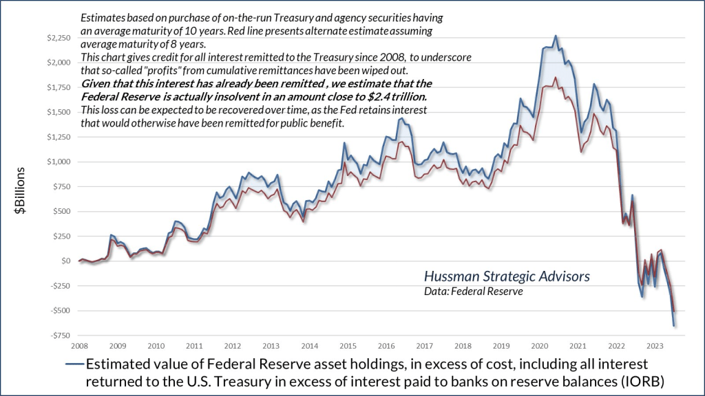 Les pertes non réalisées et bien sur non comptabilisées dans le bilan de la Fed sont colossales ; voici, ci dessous le graphique qui retrace la valeur réelle estimée des actifs qui sont au bilan de la Fed.