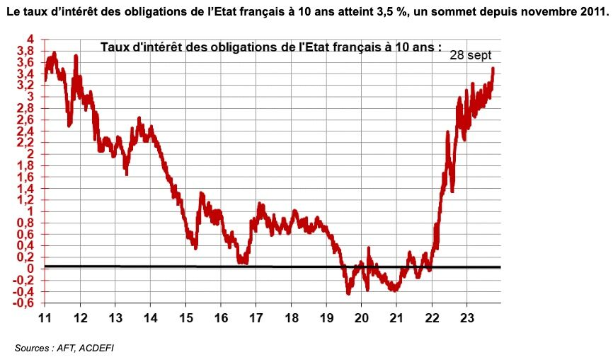 Le pire est que malgré la fin de la pandémie et normalement du “quoi qu’il en coûte”, la dette publique française continue de flamber. A une différence de taille près : dans la mesure où la BCE a enfin pris conscience des effets inflationnistes de sa “planche à billets”, elle a dû arrêter cette dernière, ce qui a mécaniquement entraîné une augmentation des taux d’intérêt des obligations d’Etat. En France, le taux d’intérêt de l’OAT 10 ans a ainsi dépassé les 3,5% le 28 septembre, soit un plafond depuis novembre 2011.