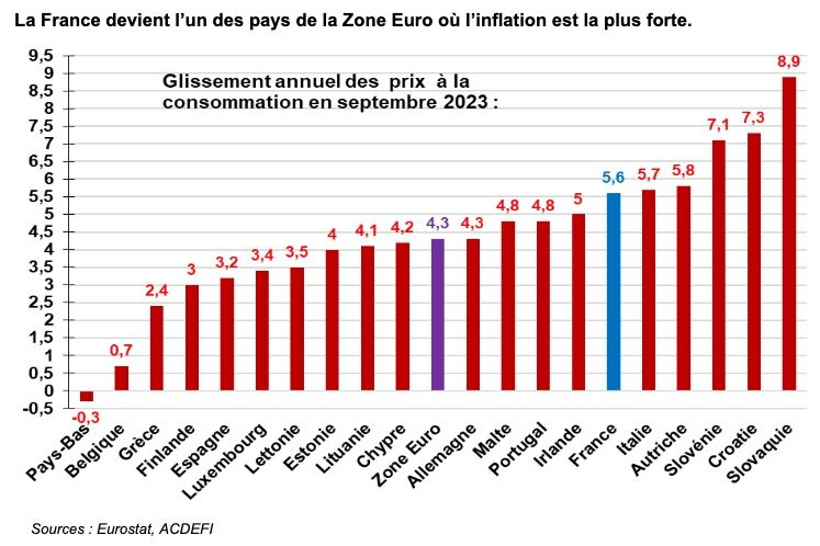 Et ce d’autant qu’en plus d’alourdir le coût de la dette, cette augmentation des taux d’intérêt va casser encore davantage l’investissement des entreprises, ainsi que la consommation et l’investissement logement des ménages. De quoi aggraver la récession qui est en train de s’installer dans notre “douce France”. Pour ne rien arranger, bien loin des promesses de forte baisse, l’inflation française s’est stabilisée à 4,9% en septembre. Avec un niveau de 5,6 % aux normes européennes harmonisées, l’inflation française dépasse ainsi de 1,3 point celle de la Zone Euro et devient l’une des plus élevées de cette dernière. Mais, à part ça, tout va très bien Madame La Marquise…