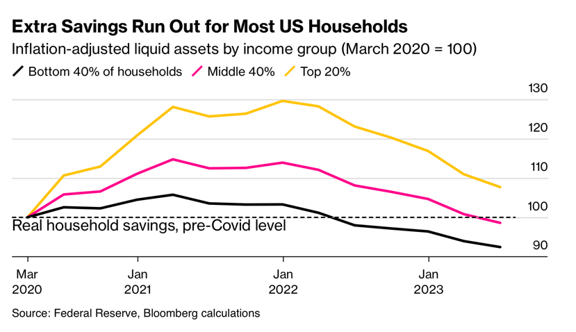 L’inflation, la hausse des loyers et la hausse des taux d’intérêt ont frappé début 2022, l’argent était déjà épuisé pour les 40 % des ménages les plus pauvres. Mais cette année, la même chose s’est produite pour les 40 % du milieu, suivis de près par des économies supplémentaires liées à la pandémie pour les 20 % les plus riches, sur une trajectoire descendante. Étant donné que les ménages aux revenus les plus élevés ont de toute façon tendance à épargner davantage, il semble que le soutien à la consommation ait déjà plus ou moins disparu.