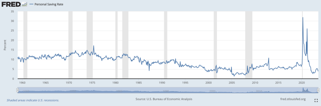 Comme pour beaucoup de choses, la véritable exception dans le graphique est la pandémie, puisque le taux d’épargne a atteint un sommet massif de 32 % lorsque les États-Unis étaient en confinement à l’échelle nationale. Mais vous pouvez voir que nous sommes déjà proches du bas de la fourchette. En prenant une simple moyenne mensuelle de 1959 à aujourd’hui, les ménages américains ont économisé environ 8,5 % de leur revenu disponible chaque mois au cours des six dernières décennies. Ce chiffre est de 9,4 % si l’on compte toutes les données mensuelles à partir de 1991.