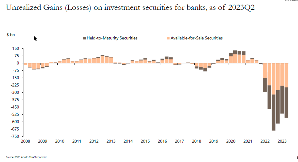 Néanmoins, les pertes-papier des banques régionales dues à la hausse des taux d’intérêt limiteront encore davantage le crédit. Une diapositive d’une récente présentation de l’économiste en chef d’Apollo Global, Torsten Slok, vous montre qu’après quelques trimestres de diminution de ces pertes, elles augmentent à nouveau. Et ils augmenteront encore davantage à mesure que les taux d’intérêt à long terme augmenteront.