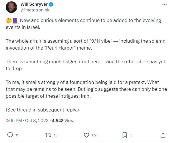| Zone litigieuse israélienne – Escarmouche localisée ? Ou le début d’un grand cygne noir mondial ? SIMPLICIUS, LE PENSEUR 9 OCTOBRE L’irruption en Israël a surpris beaucoup d’entre nous. Mais dans une certaine mesure, il s’agissait d’une escalade attendue depuis longtemps, destinée à amorcer le dénouement du conflit ukrainien, en y atténuant la chaleur. Il existe de nombreux récits qui circulent sur tout ce qui semble « anormal » à propos de l’attaque du Hamas, donc je ne raconterai pas chaque point ici car la plupart d’entre vous les ont probablement lus à plusieurs endroits ; des choses comme la brèche très invraisemblable dans les portes et les défenses de haute technologie d’Israël, les échecs sans précédent du Mossad et du Shin Bet, l’invocation étrangement scénarisée de « Pearl Harbor » par Netanyahu, ce qui est très révélateur si l’on considère que Pearl Harbor était également une attaque sous faux drapeau avec le le but d’amener les États-Unis dans la Seconde Guerre mondiale. |