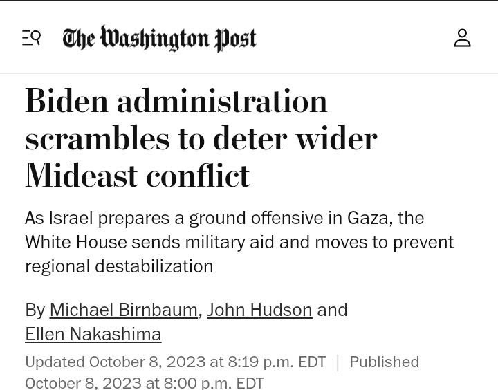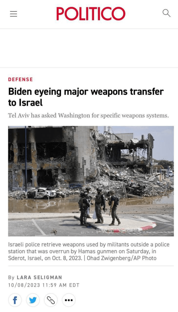En fait, les États-Unis viennent d’annoncer l’envoi du groupement tactique du porte-avions USS Gerald R. Ford dans la région de la Méditerranée orientale. Vous n’envoyez pas autant de puissance de feu si vous voulez faire la paix et désamorcer la situation. Sans oublier que des avions cargo militaires américains C17 ont déjà atterri en Israël, transportant probablement de nouvelles armes.