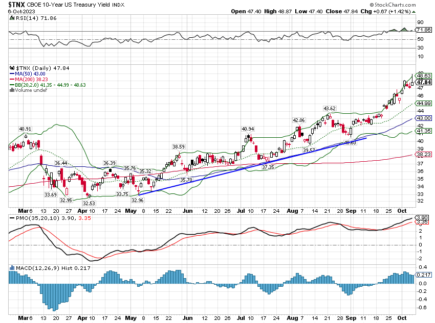 Eh bien, peut-être, mais vous ne le sauriez pas à la première réaction du marché boursier, qui a été résolument négative. Le S&P 500 a perdu plus de 38 points – près de 1 % – quelques minutes après l’ouverture. Le rendement des bons du Trésor à 10 ans a grimpé de 17 points de base et cela a été le déclencheur pour les traders qui, au cours des deux derniers mois, ont vendu des actions à chaque tick de rendement plus élevé. La crainte évidente était que ce rapport solide pousse la Fed à augmenter davantage ses taux. Et la peur a vaincu l’avidité au cours de la première demi-heure de négociation.