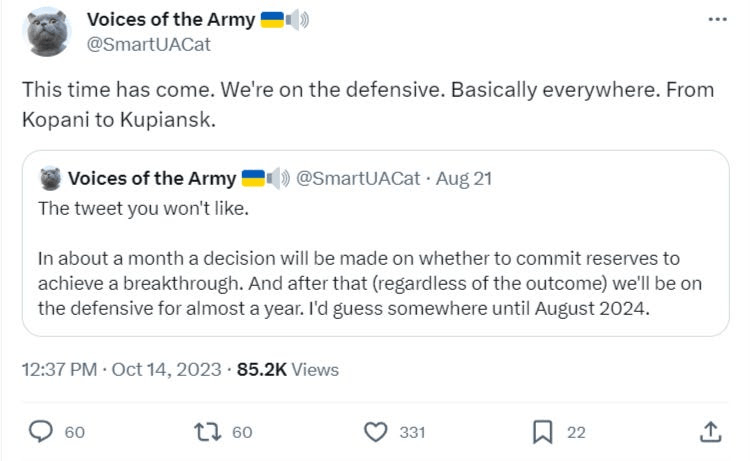 Le tweet que vous n’aimerez pas. Dans environ un mois, une décision sera prise quant à l’opportunité d’engager des réserves pour réaliser une percée. Et après cela (quel que soit le résultat), nous serons sur la défensive pendant près d’un an. Je suppose que quelque part jusqu’en août 2024.