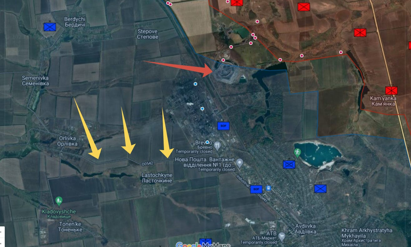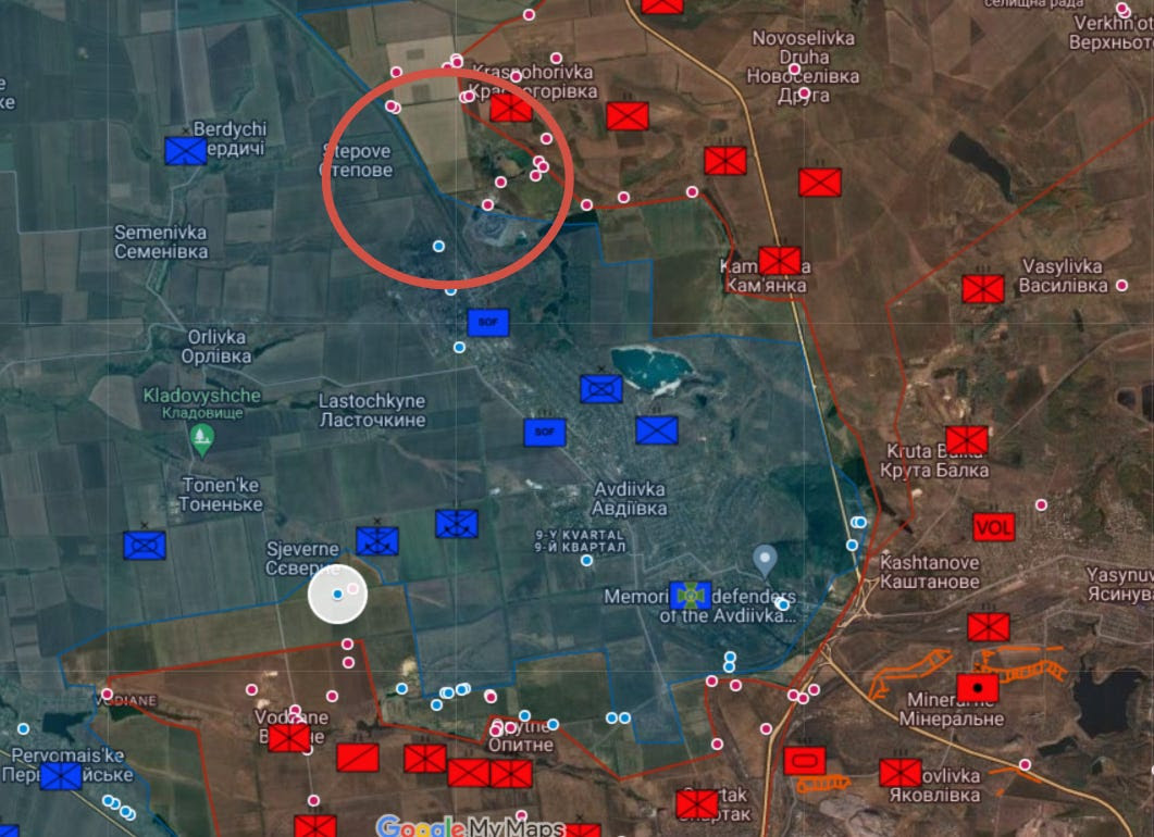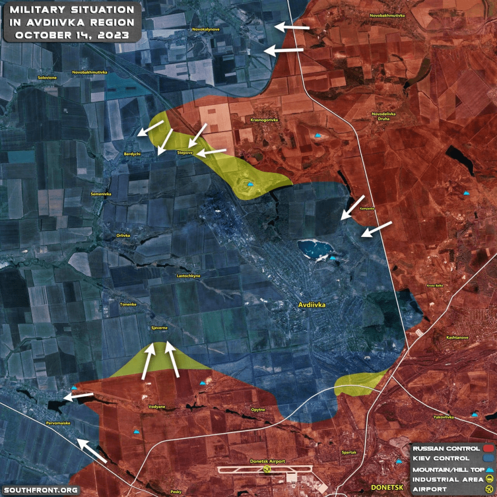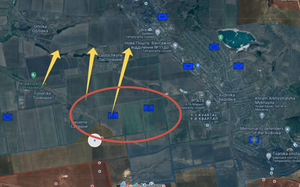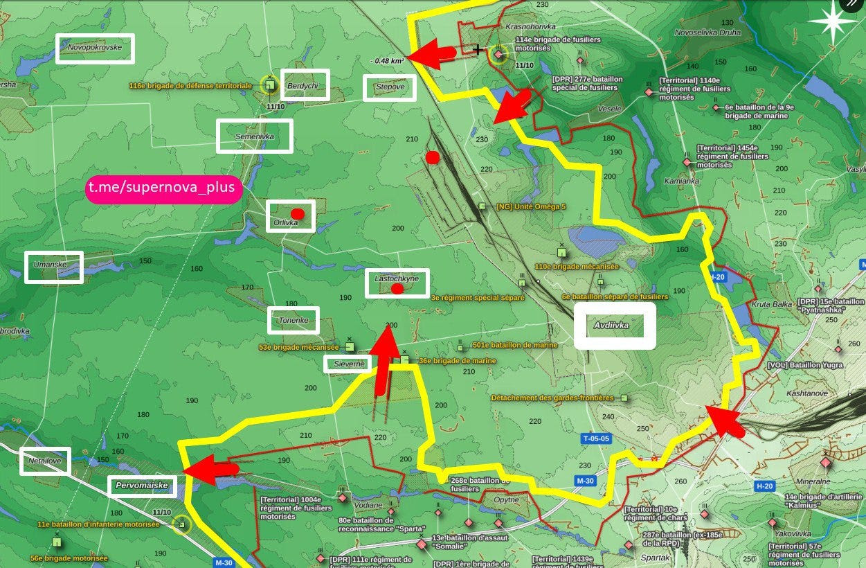 Les correspondants ukrainiens affirment que l’offensive comporte jusqu’à 10 axes ou vecteurs. Les deux plus importants sont ceux venant de Krasnogorovka vers le terril du nord, et celui du sud direct. D’autres vecteurs incluent Vodiane, également dans le sud, ainsi qu’Opytne, se dirigeant directement vers la ville d’Avdeevka elle-même, visible ici :
