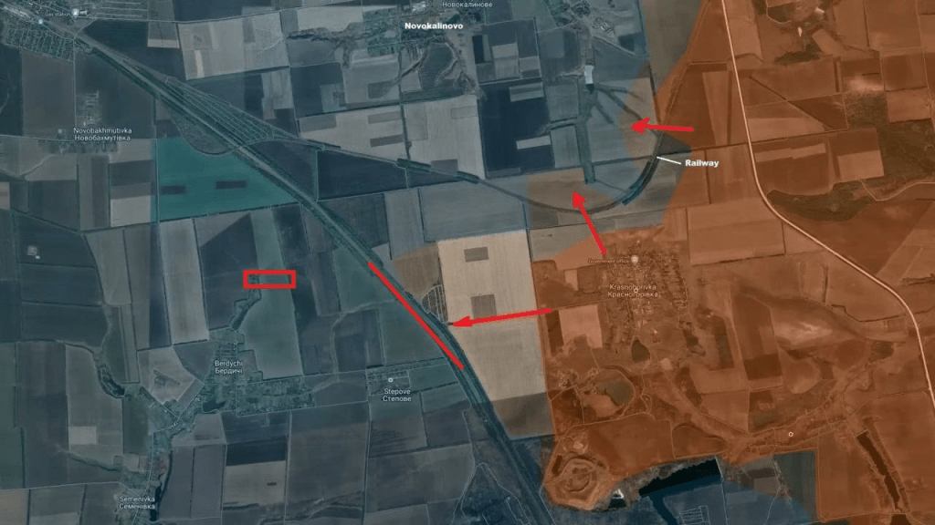 La zone rouge à l’ouest de la voie ferrée est une position boisée juste à la périphérie de Berdichi dans laquelle, selon certains rapports, des unités avancées russes se seraient intégrées. Malheureusement, il n’y a aucune véritable confirmation de cela.