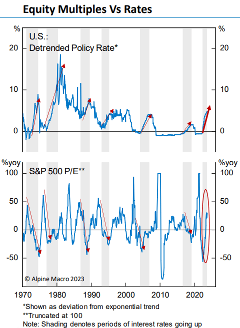 Normalement quand les taux d ‘intérêt montent, la théorie enseigne que les multiples cours bénéfices, les PER doivent baisser, c’est dit-on, mathématique. Ici, les taux montent et les multiple cours-bénéfices montent également.