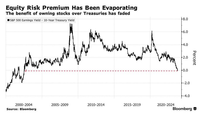 Les actifs financiers dits à risque , ceux qui bénéficient de l’appétit pour le risque et le jeu, sont encore très recherchés. La preuve, la prime de risque s’est évaporée ce qui signifie que vous n’êtes plus rémunéré pour prendre des risques. Cela va à l’encontre de la théorie financière dominante.