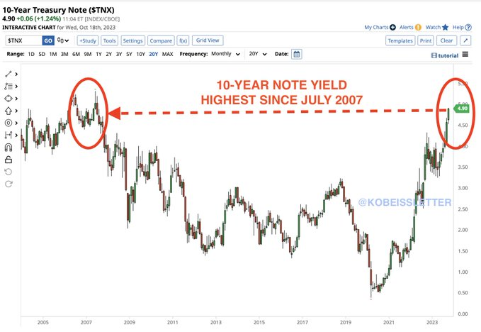 Les rendements du Trésor à dix ans ont bondi de 30 points de base cette semaine (à 4,91 %), s’échangeant tôt vendredi à 4,99 % – le plus haut depuis juillet 2007.