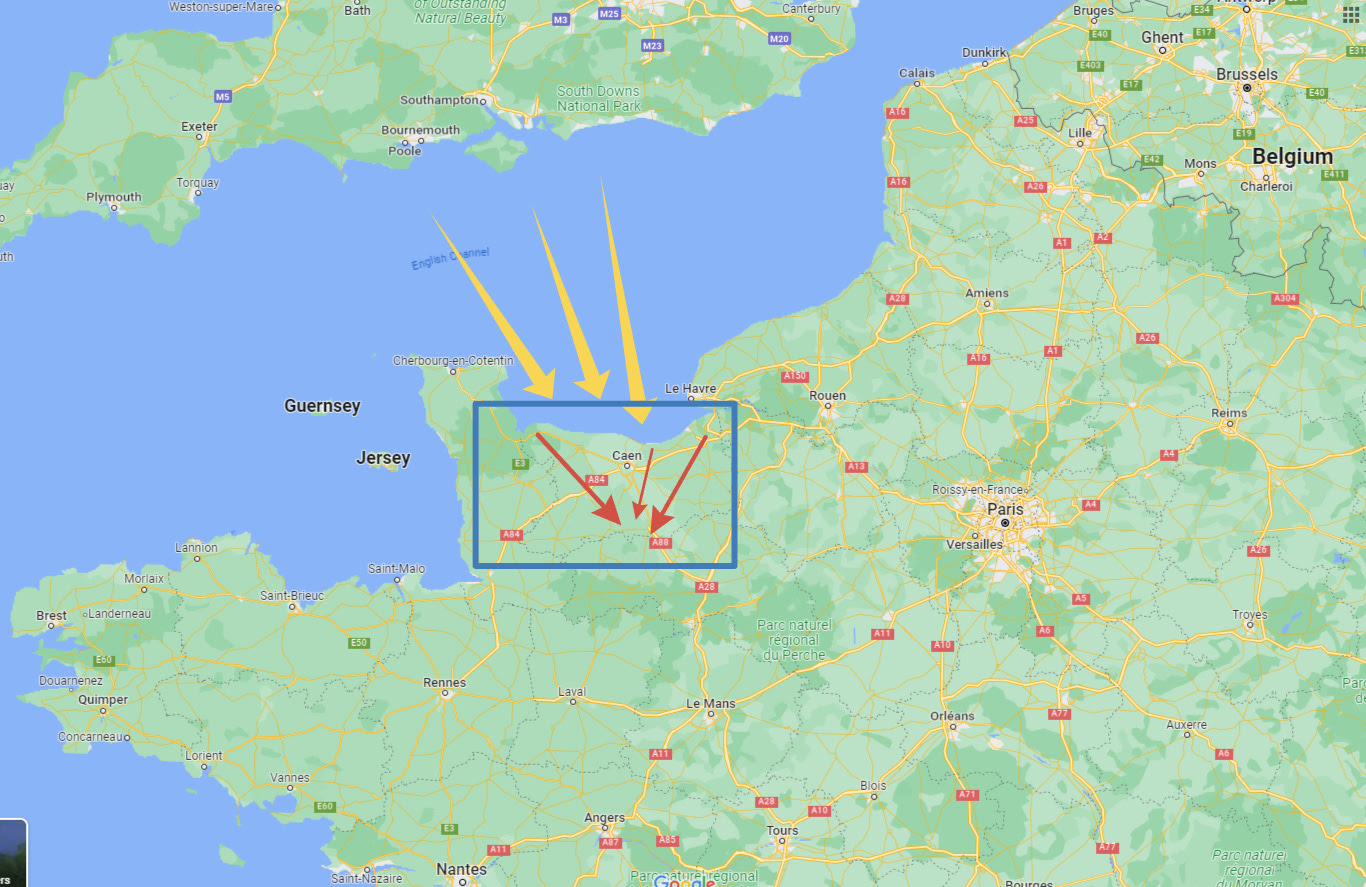 Ici vous pouvez voir les flèches jaunes représentant le trajet du débarquement sur les plages normandes du nord de la France. Les flèches rouges représentent la façon dont les forces alliées ont dû étendre leur zone de contrôle, pour finalement libérer Paris et avancer péniblement.