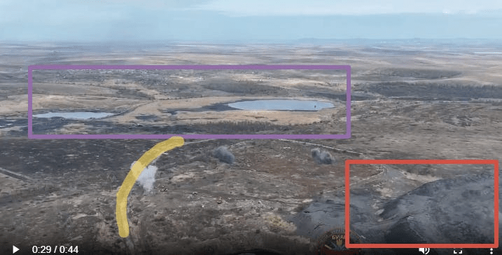 Une fois de plus, nous voyons une colonne s’approcher sur une seule ligne de fichier. Ceci a pour but d’éviter le champ de mines et semble être le seul moyen semi-réalisable d’approcher une position ennemie dans une guerre moderne à forte intensité de mines. C’est la même tactique que l’Ukraine a tenté d’utiliser lors du tristement célèbre carambolage Zaporozhye-Rabotino Leopard 2.
