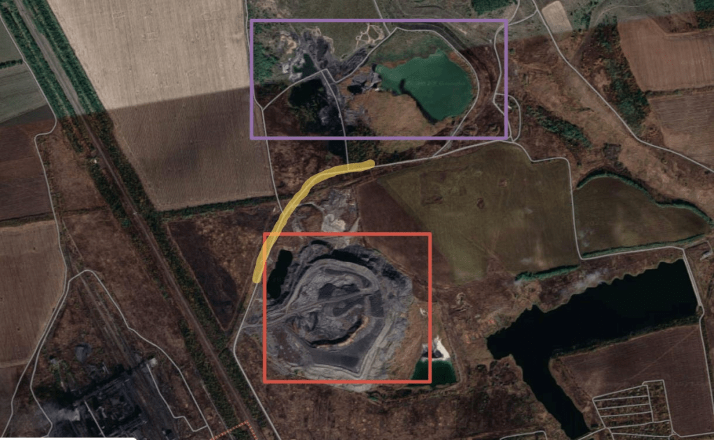 Le rouge est le bord du terril, le violet sont ces bassins de déversement et le jaune est la route courbe :