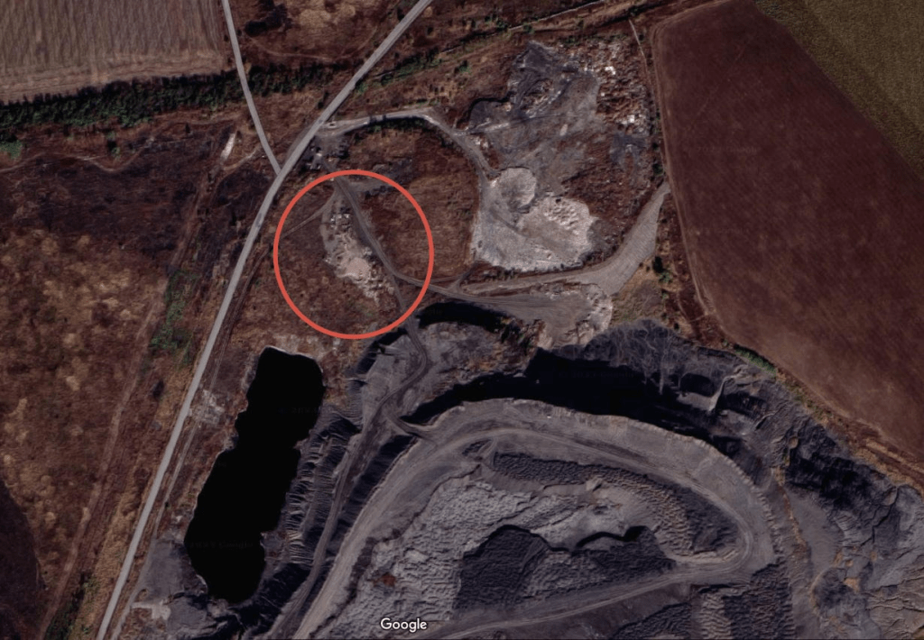 En zoomant, il semble qu’une grande partie de l’armure ait quitté la route jusqu’à cet endroit, juste à côté du terril :