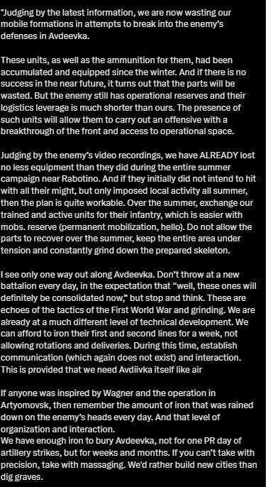 La chaîne TG « Spy’s Dossier » a écrit la critique cinglante suivante du commandement russe concernant sa planification et son exécution de l’offensive pour capturer #Avdiivka