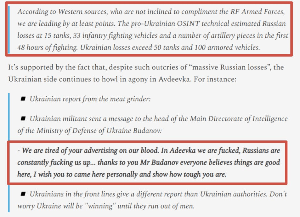 Les comptes pro-ukrainiens continuent de mettre l’accent sur leurs arguments en publiant des «mises à jour» triées sur le volet à partir de comptes catastrophistes russes qui critiquent l’opération Avdeevka. Par exemple, un article populaire qui circule est un nouveau message critique de la chaîne russe TG Grey Zone qui affirme que la Russie « gaspille ses formations mobiles » et affirme que la Russie a perdu plus d’équipements que l’ensemble de l’offensive ukrainienne de Zaporozhye :