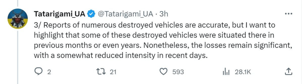 En fin de compte, nous devons attendre et voir dans quelle mesure cela persiste, car la situation reste dynamique. D’après ce que nous savons, l’Ukraine pourrait repousser les forces russes hors des terrils et de la région de Stepove et les progrès pourraient soudainement s’arrêter. Mais pour l’instant, compte tenu des informations dont nous disposons, je suis personnellement confiant quant à la direction que prendra l’offensive jusqu’à présent. D’autant plus que nous disposons désormais d’évaluations assez fiables selon lesquelles l’AFU subit effectivement un plus grand nombre de pertes. J’avoue que les pertes de véhicules/blindés ne sont pas concluantes, et il est possible que la Russie subisse des pertes plus lourdes que l’AFU là-bas, même si je ne serais pas surpris si ce n’était pas le cas.