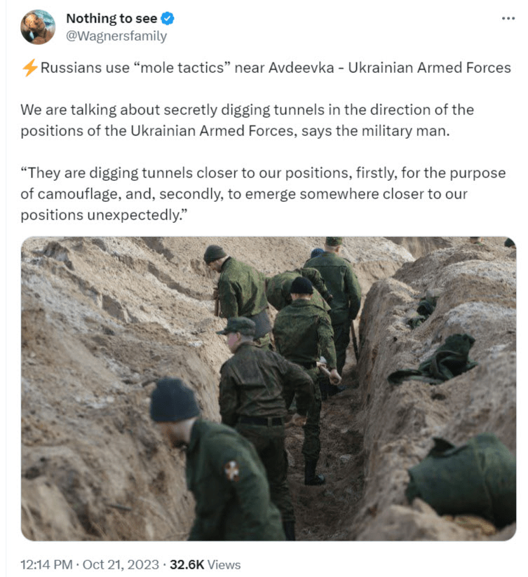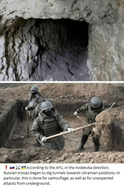 Curieusement, il mentionne avoir une astuce ou une idée sur laquelle ils travaillent actuellement et qui annulerait vraisemblablement ce qui précède. La raison pour laquelle c’est intéressant est que les chaînes ukrainiennes ont rapporté aujourd’hui que les forces russes « creusent des tunnels » vers les positions ukrainiennes sur Avdeevka afin de contourner certaines zones fortement fortifiées et de « sortir » par surprise
