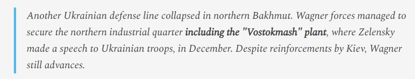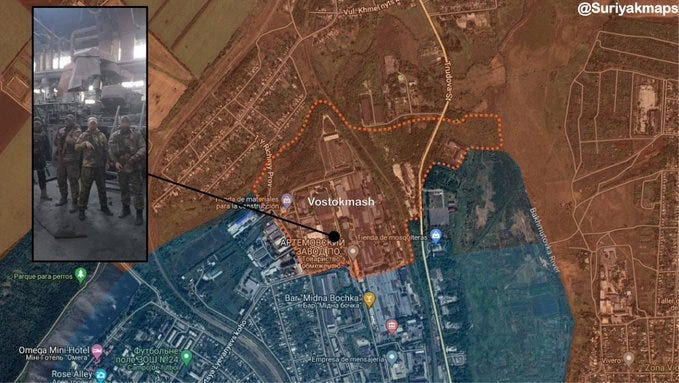 Il existe de nombreux précédents où les forces russes se sont installées dans de grandes entreprises industrielles alors même que les AFU y sont toujours, puis les ont lentement évincées. En fait, Bakhmut lui-même a été capturé de cette façon – voici les captures d’écran d’un de mes rapports de mars 2023