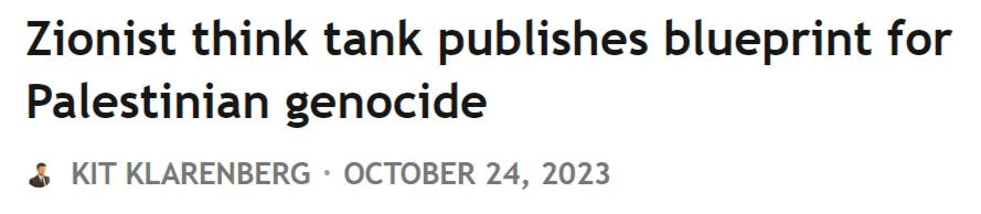 Dans un livre blanc publié plus d’une semaine après l’attaque surprise menée par le Hamas contre des bases militaires et des kibboutz israéliens, l’Institut pour la sécurité nationale et la stratégie sioniste a présenté « un plan de réinstallation et de réhabilitation finale en Égypte de l’ensemble de la population de Gaza », basé sur sur « l’opportunité unique et rare d’évacuer l’ensemble de la bande de Gaza » qu’a fournie la dernière attaque israélienne contre l’enclave côtière assiégée.