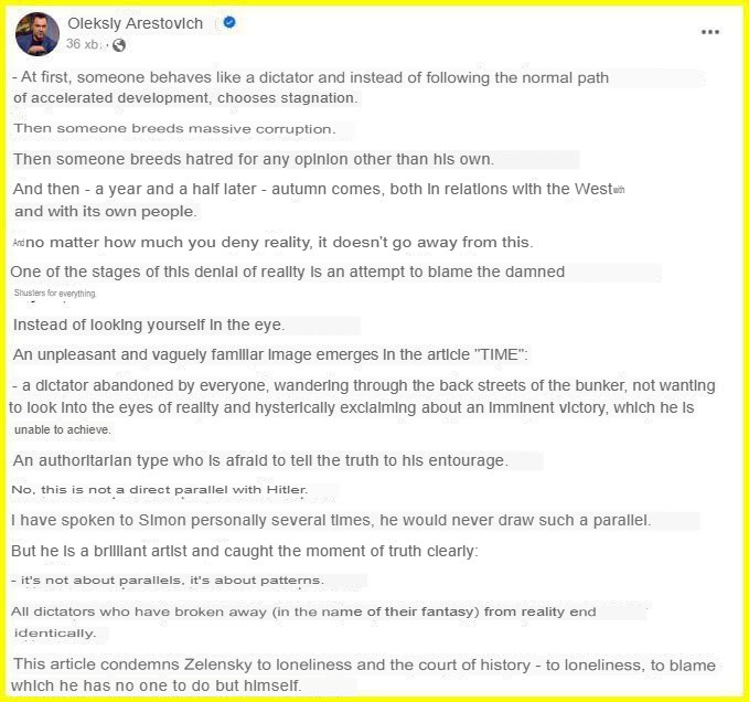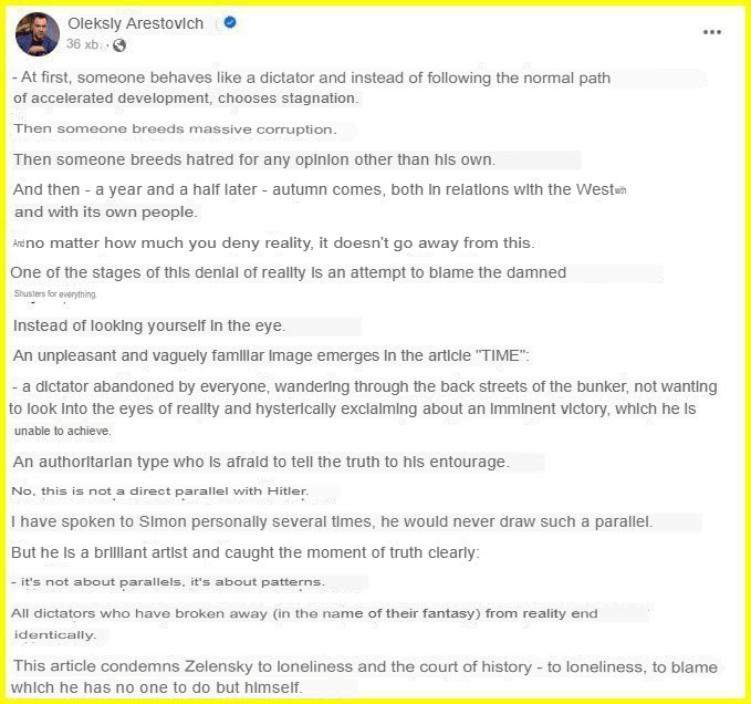 L’article aborde la corruption avec les mêmes vieilles histoires dont nous savons tous qu’elles sont omniprésentes. Le seul point intéressant à retenir est qu’Arestovich a ensuite commenté l’article, non seulement en accord avec les éléments de corruption, mais en décrivant Zelensky exactement sur le ton solitaire et détaché d’un dictateur