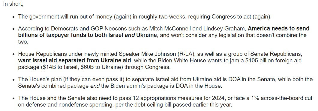 Ainsi, le projet de la Chambre visant à séparer l’aide d’Israël de celle de l’Ukraine est complètement mort dès son arrivée au Sénat. Mais le projet du Sénat visant à combiner les deux est complètement abandonné à la Chambre. Aucune des deux parties ne peut s’entendre et il semble que personne ne sache précisément ce qui se passera si l’impasse persiste jusqu’à l’épuisement du budget.