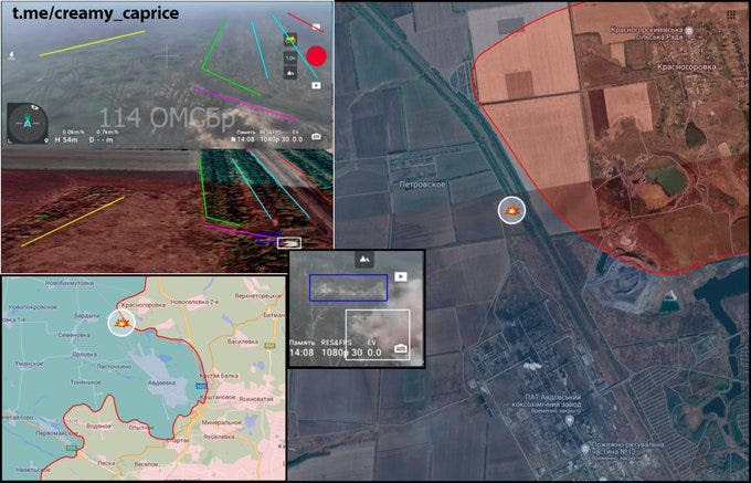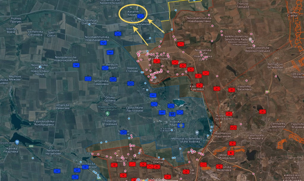 Peu de temps après ce message, que j’ai moi-même rejeté comme étant peut-être une mauvaise direction délibérée, il a été annoncé que l’AFU avait en fait lancé sa propre contre-attaque depuis le nord afin de tenter de couper les forces russes vers Krasnogorovka. Mais cela a été suivi par des rapports, comme celui ci-dessous en provenance de Rybar, selon lesquels les forces russes ont également attaqué Keramik là-bas :
