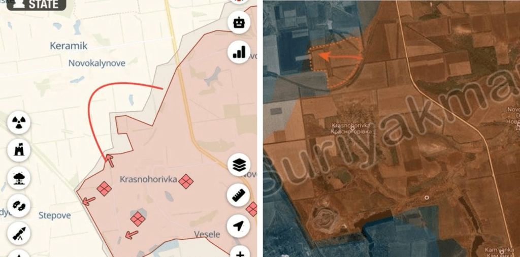 Certains d’entre eux font mention de l’autre avancée la plus importante, à savoir que les forces russes ont de nouveau rampé de quelques centaines de mètres supplémentaires au sud en direction de la limite de Severnoe, vue ici sur la carte de Suriyak