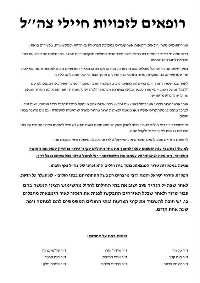 « Celui qui intègre le terrorisme dans les hôpitaux doit comprendre qu’il n’a pas d’endroit sûr et s’accrocher aux cornes de l’autel », poursuit la lettre, faisant référence à Rois 2 : 28.