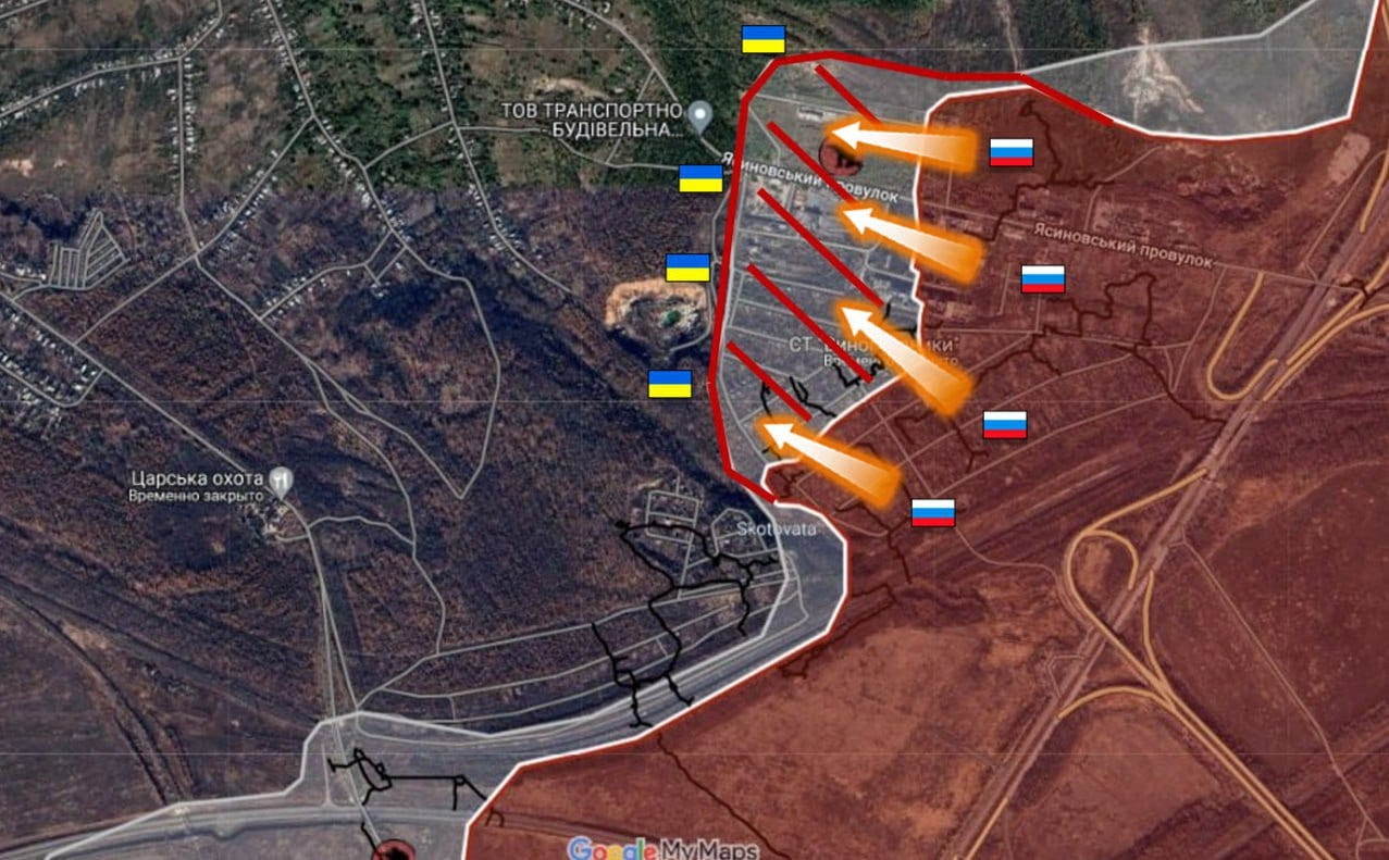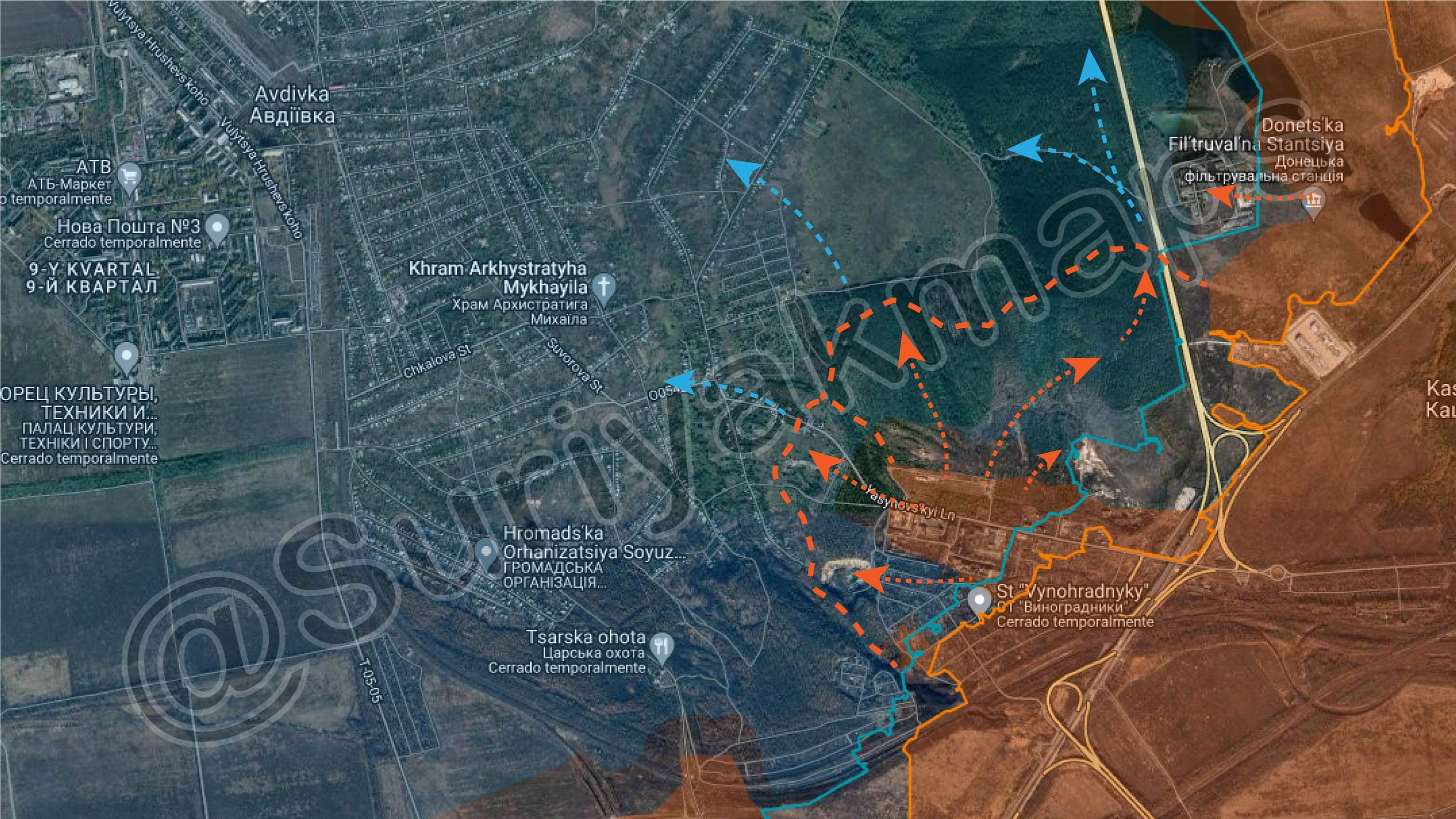 Après la capture de la zone industrielle de Promka, le prochain objectif de l’#ArméeRusse serait la capture des carrières et des fermes de Vinogradniki, d’où elles pourront surveiller les mouvements ukrainiens dans la zone forestière, précisément la pénétration dans la zone urbaine continuera à être réduite de prendre de nouvelles parties de l’avenue Yasynovatskyi, d’où établir un contrôle des incendies sur la partie basse qui divise la ville. Simultanément, les troupes russes s’empareront de la zone forestière qui s’étend à l’arrière des défenses ukrainiennes le long de la H-20 afin de prendre le contrôle solide de la station de filtration de Donetsk. Cependant, comme indiqué précédemment, l’avancée russe sera difficile en raison du grand nombre de défenses dans cette zone forestière et un effondrement des forces n’est pas attendu tant que le front nord ne progresse pas.