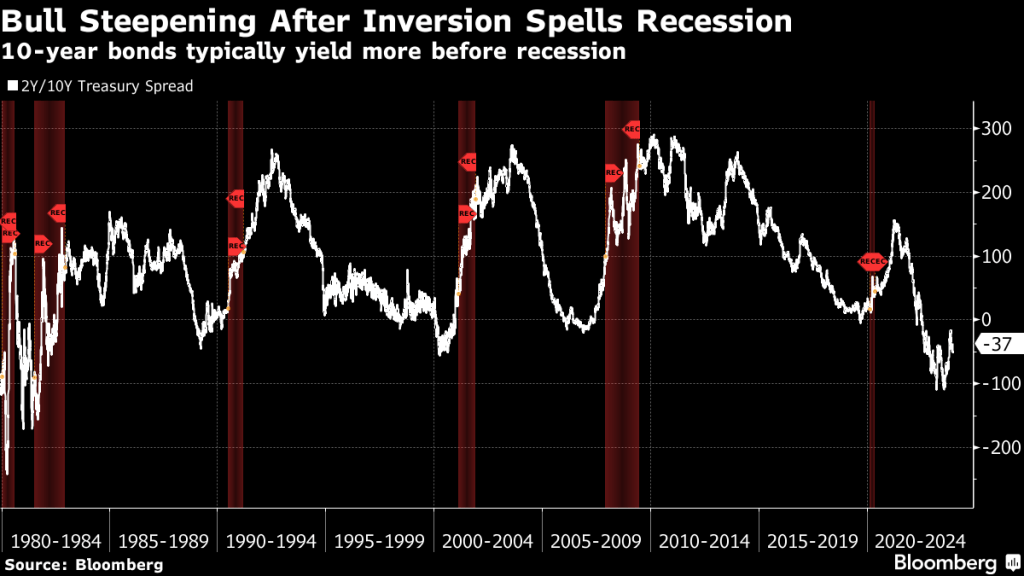 Il nous reste encore du chemin à parcourir avant d’obtenir un signal définitif, car la façon dont cela a eu tendance à fonctionner lors de toutes les récessions précédentes au cours des quatre dernières décennies est que la courbe du Trésor s’inverse d’abord, puis se pentifie à nouveau.