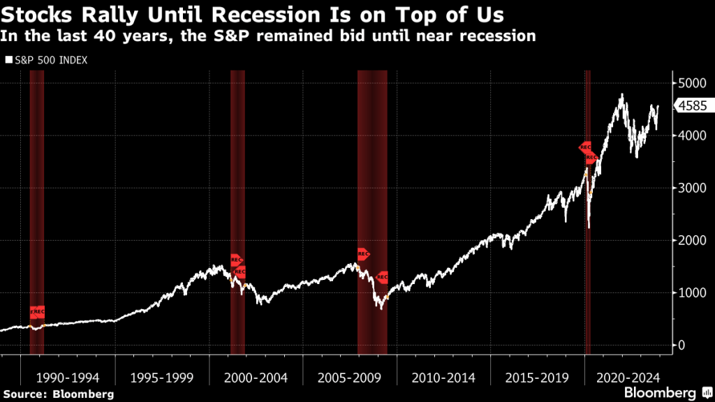 Et, d’une certaine manière, cela a du sens. Comme je l’ai souligné ici précédemment, les actions en général restent recherchées jusqu’à ce que la récession s’installe. Au cours de chaque cycle économique des 40 dernières années, vous avez vu le S&P 500 rester proche de ses sommets cycliques jusqu’à ce que la récession approche à grands pas