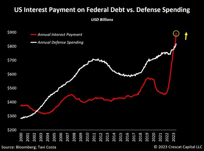3 décembre 2023 Voila pourquoi les USA sont obligés d’essayer d’effondrer les taux! Et pourquoi il faut « ajuster » l’inflation saisonnièrement et politiquement. Les paiements pour la défense sont dépassés par les paiements liés au coût de la dette! Partager : Partager sur X(ouvre dans une nouvelle fenêtre) X Partager sur Facebook(ouvre dans une nouvelle fenêtre) Facebook J’aime chargement… Similaire
