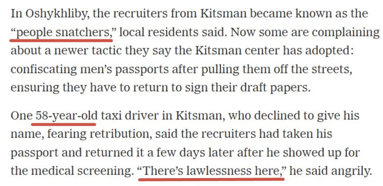 Le Times continue en rapportant que les personnes handicapées et même celles censées être exemptées font toutes partie des récents efforts de regroupement, qui voient les commissaires de l’AFU voler leurs papiers pour les empêcher de se dérober . L’article met en avant diverses méthodes d’intimidation et de simples enlèvements en pleine nuit.
