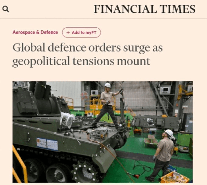 Selon le Financial Times « Une analyse de 15 entreprises de défense, qui comprend non seulement les plus grands fabricants américains mais aussi le britannique BAE Systems et le sud-coréen Hanwha Aerospace, a révélé que le carnet de commandes combiné des quinze plus grandes entreprises atteignait 777 milliards de dollars à la fin de 2022. Au cours des six premiers mois de 2023, le carnet de commandes a atteint 764 milliards de dollars.