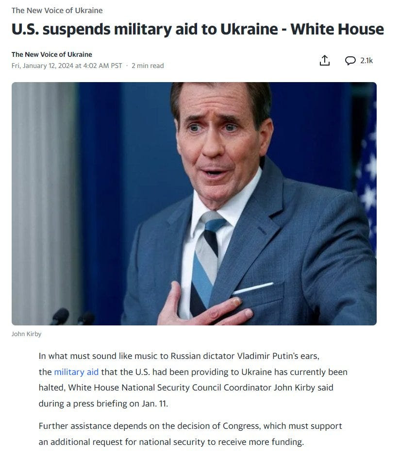 IL a été rejoint par John Kirby qui a déclaré que toute aide militaire à l’Ukraine était effectivement suspendue pour le moment, car il n’y avait « plus de fonds
