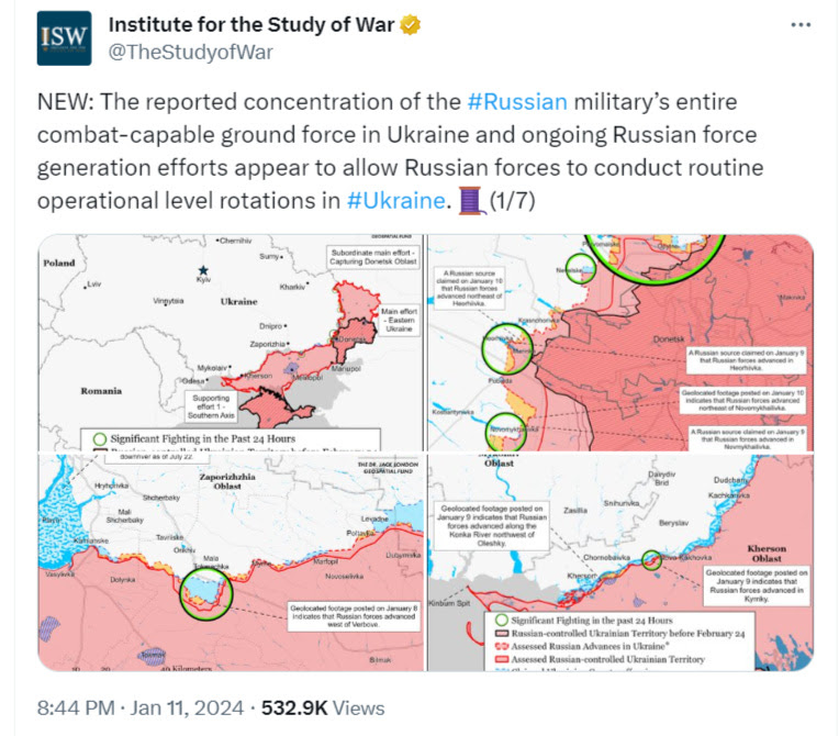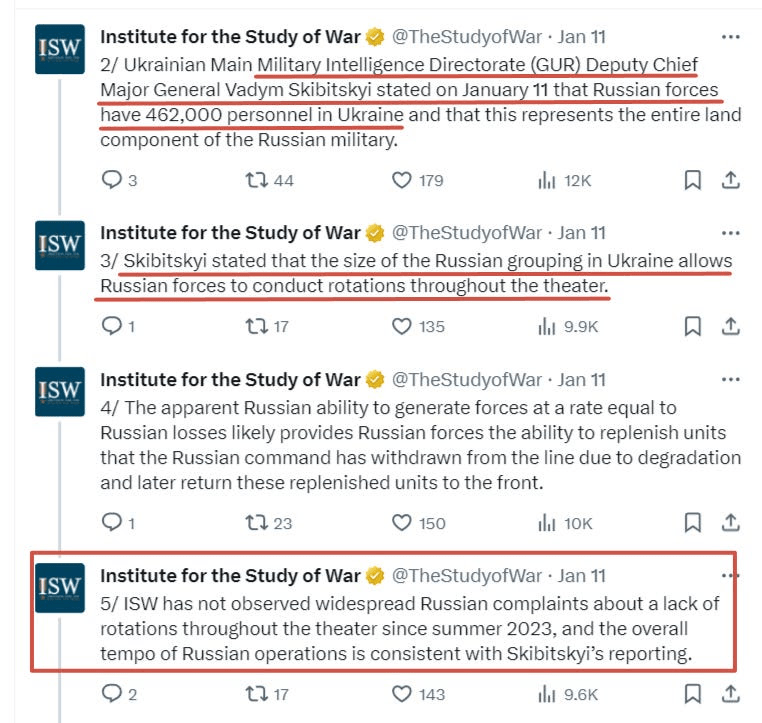 L’Institut pour l’étude de la guerre a réussi à admettre non seulement que la Russie a toute l’initiative, mais qu’elle dispose de 95 % d’effectifs dans ses unités, ce qui permet une rotation et une génération de forces opportunes et professionnelles