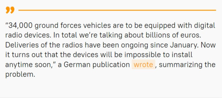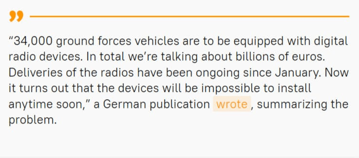 En règle générale, les Baofeng les moins chers et autres sont utilisés uniquement à courte portée, comme par exemple un commandant de batterie d’artillerie communiquant les instructions de tir à ses troupes à plusieurs mètres de distance. Ceci est considéré comme relativement sûr car les radios n’ont de toute façon pas une portée énorme, leur signal ne peut donc pas être intercepté de manière fiable. Les communications avec des unités distantes s’effectuent généralement à l’aide de systèmes cryptés et plus standardisés comme Azart, mais de nombreux problèmes restent encore à résoudre et les troupes russes se plaignent souvent de problèmes de communication entre unités situées à des distances moyennes de 5 à 15 km. C’est un domaine dans lequel les États-Unis et l’OTAN ont un net avantage. Cependant, il faut dire que cet avantage est essentiellement sur le papier et n’a pas été prouvé dans un environnement réel de guerre électronique. Je dis cela parce qu’il existe de nombreux rapports faisant allusion à des problèmes majeurs de l’OTAN dans ce domaine également ; par exemple, des problèmes ont été signalés chez les Marders/Léopards allemands sur les terrains d’entraînement, citant spécifiquement que leurs systèmes de communication ne fonctionnaient pas et que les commandants étaient obligés d’ouvrir la trappe pour « crier » des instructions aux unités à proximité. Par exemple
