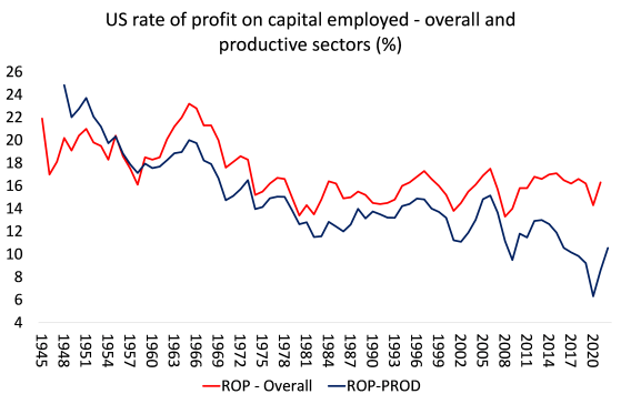 Le taux de profit sur le capital total a diminué à mesure que le PIB par habitant d’un pays augmentait en raison de la plus grande part de capital improductif dans les pays riches. Par ailleurs les activités improductives augmentent avec le développement économique .