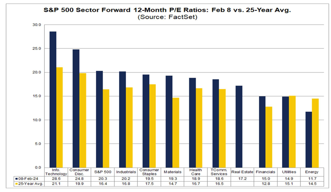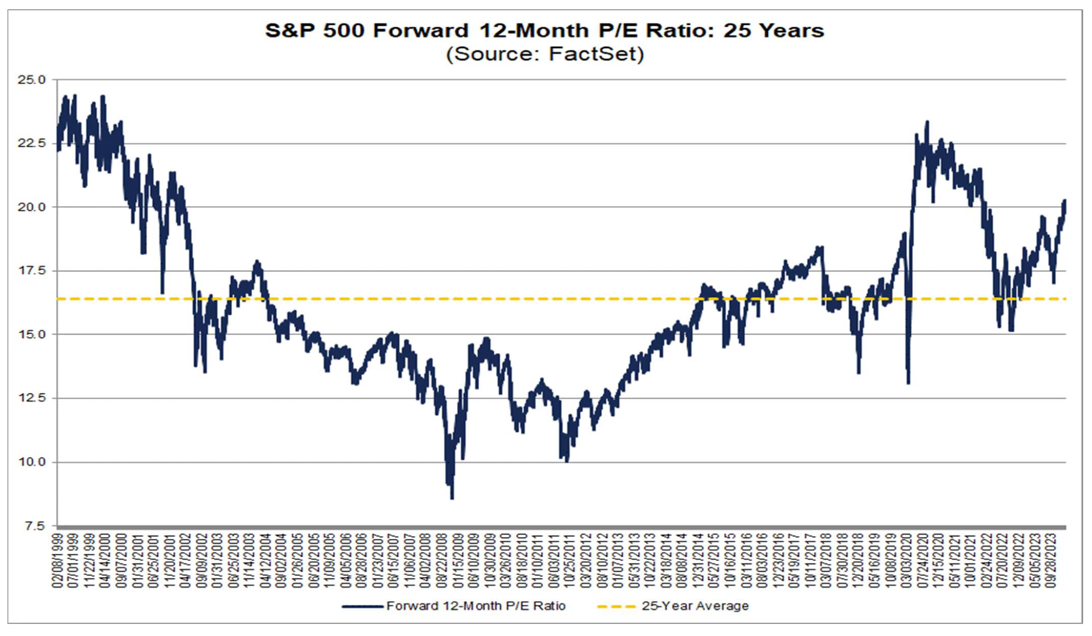 Le 27 octobre, le ratio P/E à terme sur 12 mois était de 17,0, le prix de l’indice ayant atteint sa valeur la plus basse depuis le 24 mai à 4 117,37. Depuis le 27 octobre, le prix du S&P 500 a augmenté de 21,4 %, tandis que l’estimation prévisionnelle du BPA sur 12 mois a augmenté de 2,0 %. Ainsi, l’augmentation du « P » a été le principal moteur de l’augmentation du ratio P/E au cours des derniers mois