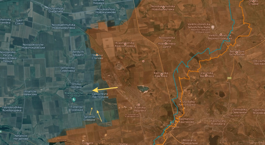 Les lignes jaunes représentent la direction approximative des combats actuels alors que les forces russes tenteraient de prendre d’assaut Latochkino – certains premiers rapports affirmaient déjà que la ville avait été prise, ou du moins que l’AFU s’en était retirée, créant une zone grise – avec l’extension logique que les forces du sud, près de Severne, tenteront de combler la nouvelle brèche formée au nord de l’ancienne zone de Zenit/base de défense aérienne.