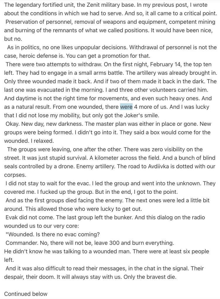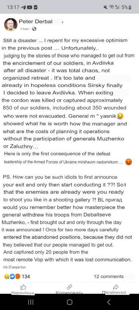 Il est intéressant de noter que la rumeur veut que Zelensky cherchait désespérément à retenir Avdeevka pendant son séjour à la conférence de Munich, afin de ne pas être humilié. Cependant, l’ordre de retrait n’a été donné que parce que la 3e Brigade (Azov) avait déjà totalement annulé les ordres et avait commencé à se retirer d’elle-même, d’autres unités pouvant éventuellement suivre. Pour éviter un effondrement total du commandement, Syrsky a été contraint de donner un ordre officiel de retrait, mais Zelensky serait furieux, selon la chaîne Resident_UA :