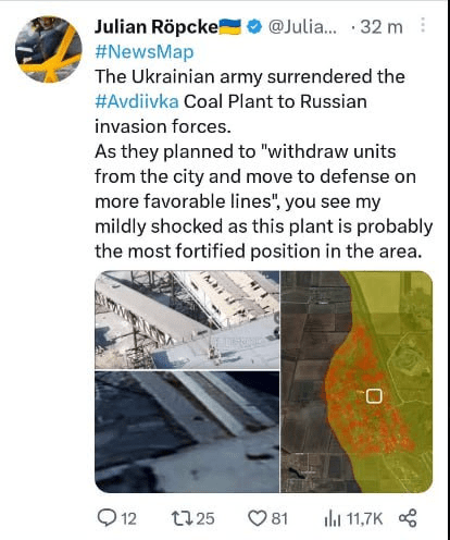 Eh bien, c’est finalement arrivé : Avdeevka est tombée, ou devrais-je dire Avdeyevka , comme le disent de nombreux médias comme Spoutnik, maintenant qu’elle est rentrée chez elle.
