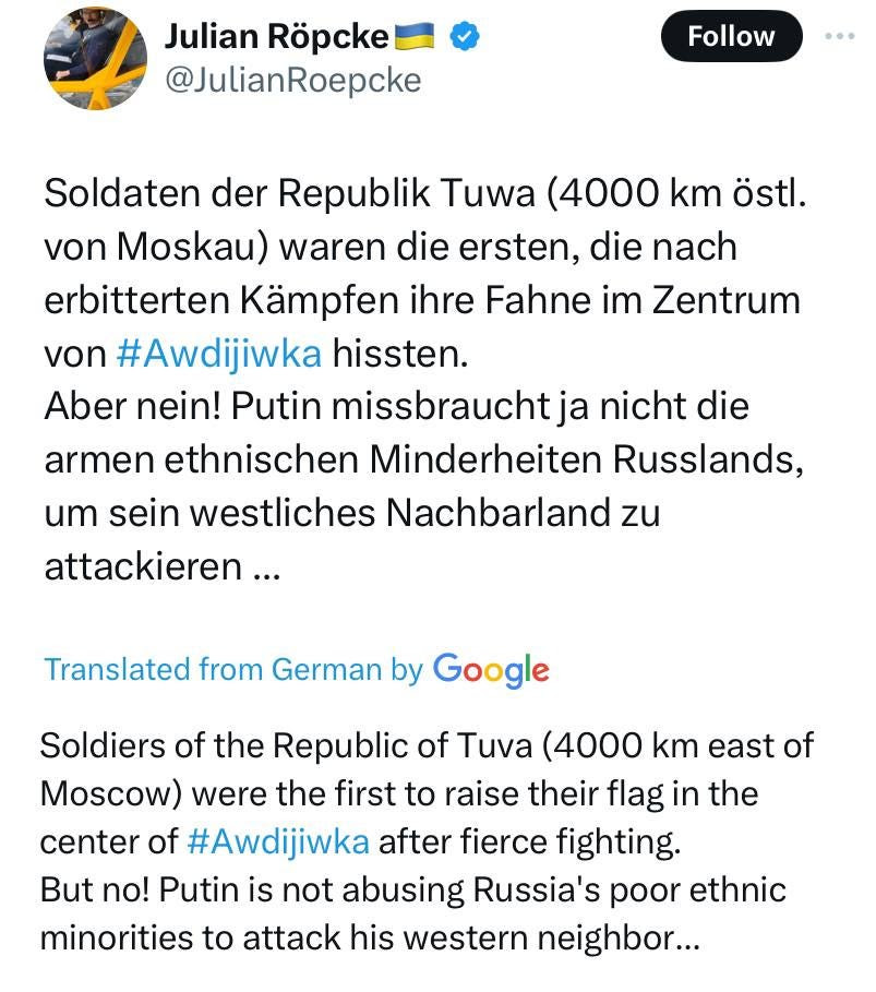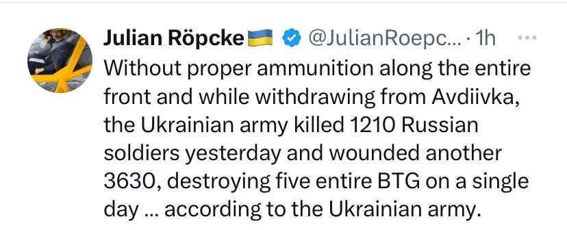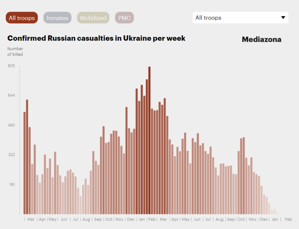 La dernière solution de consolation de l’Ukraine est que la Russie a subi entre 50 et 100 000 pertes en prenant Avdeevka, du moins c’est ce qu’ils prétendent. Malheureusement, cela n’est pas du tout soutenu par leurs propres analystes les plus méticuleux en matière de pertes, comme MediaZona, qui voit encore les pertes russes diminuer fortement au cours des deux derniers mois