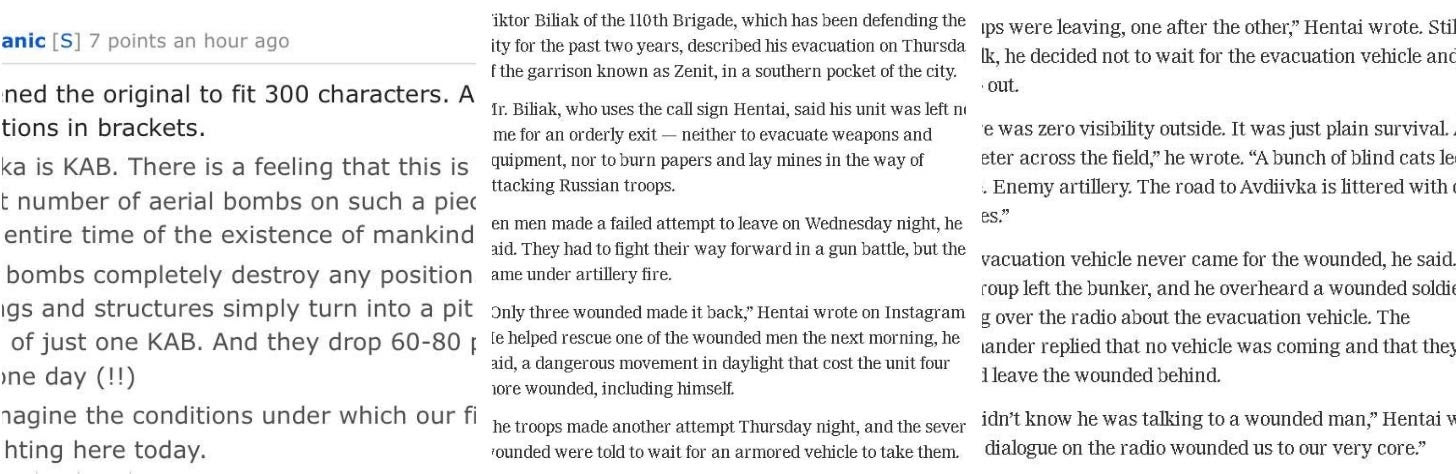 Certaines révélations ont confirmé des informations de longue date, comme celle selon laquelle les commandants de bataillon de la zone seraient assis à 40 km de là, à Pokrovsk, et refuseraient de venir au front.